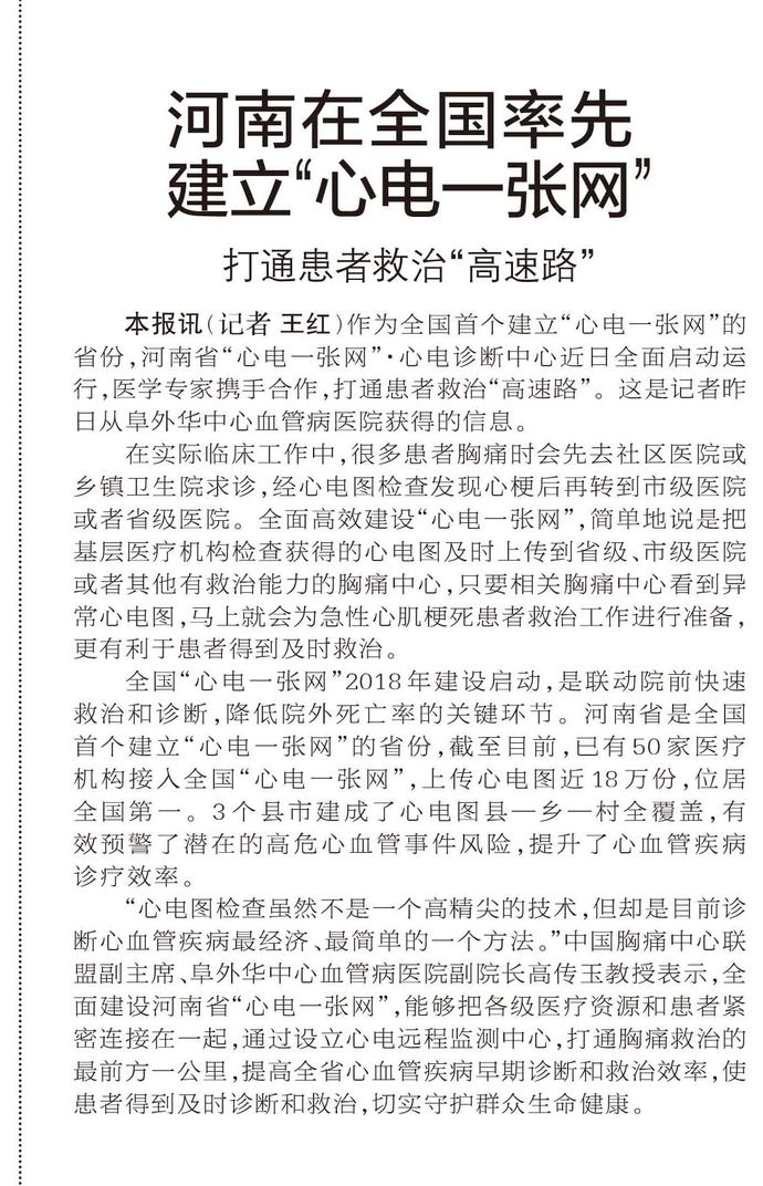 作为全国首个建立“心电一张网”的省份,河南省“心电一张网”·心电诊断中心近日全面启动运行,医学专家携手合作,打通患者救治“高速路”。这是记者昨日从阜外华中心血管病医院获得的信息。(今日《郑州日报》1版)