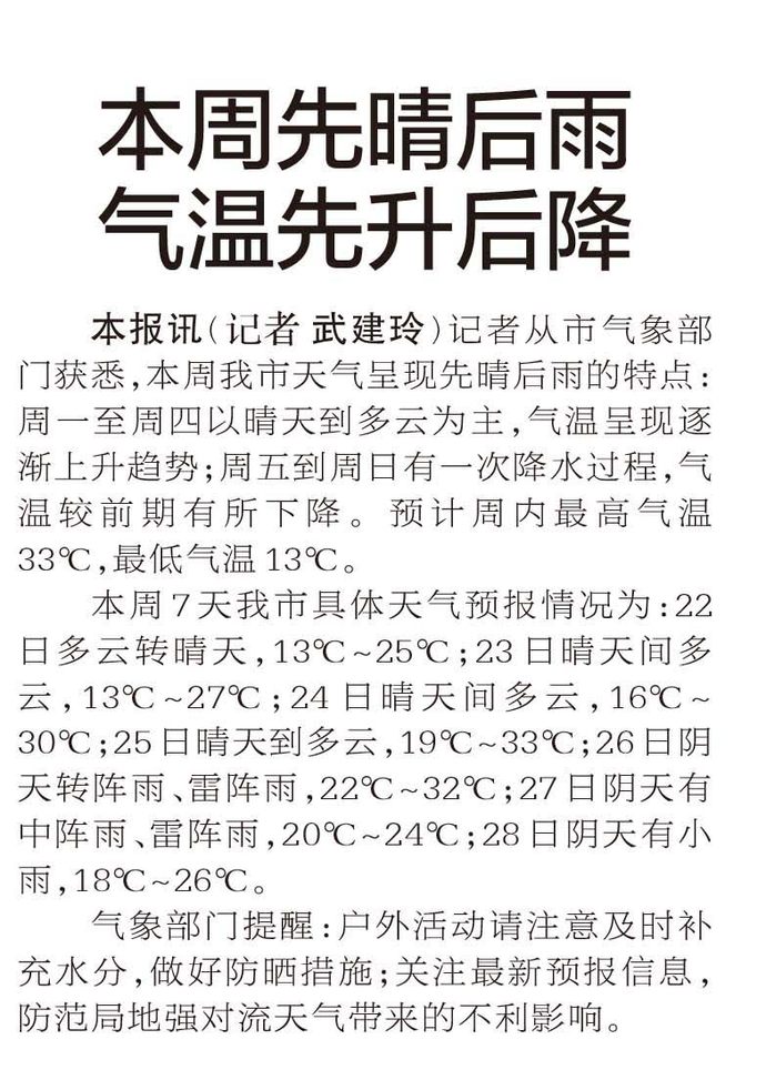 记者从市气象部门获悉,本周我市天气呈现先晴后雨的特点:周一至周四以晴天到多云为主,气温呈现逐渐上升趋势;周五到周日有一次降水过程,气温较前期有所下降。预计周内最高气温33℃,最低气温13℃。(今日《郑州日报》1版)