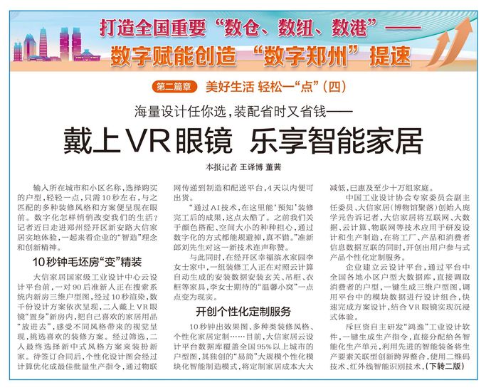 输入所在城市和小区名称,选择购买的户型,轻轻一点,只需10秒左右,与之匹配的多种装修风格和方案便呈现在眼前。数字化怎样悄悄改变我们的生活?记者近日走进郑州经开区新安路大信家居实地体验,一起来看企业的“智造”理念和创新精神。(今日《郑州日报》1版、2版)