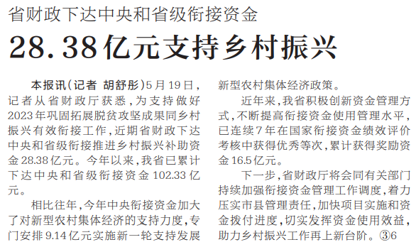 5月19日,记者从省财政厅获悉,为支持做好2023年巩固拓展脱贫攻坚成果同乡村振兴有效衔接工作,近期省财政下达中央和省级衔接推进乡村振兴补助资金28.38亿元。今年以来,我省已累计下达中央和省级衔接资金102.33亿元。(今日《河南日报》2版)