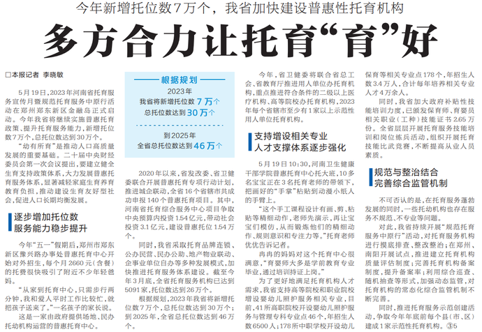 5月19日,2023年河南省托育服务宣传月暨规范托育服务中原行活动在郑州郑东新区金融岛正式启动。今年我省将继续实施普惠托育政策、提升托育服务能力,新增托位数7万个,总托位数达到30万个。(今日《河南日报》2版)