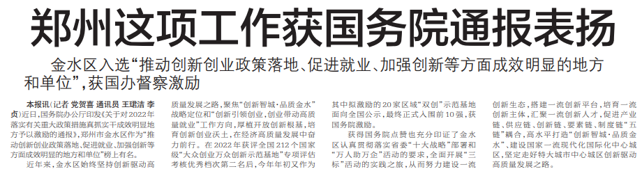 近日,国务院办公厅印发《关于对2022年落实有关重大政策措施真抓实干成效明显地方予以激励的通报》,郑州市金水区作为“推动创新创业政策落地、促进就业、加强创新等方面成效明显的地方和单位”榜上有名。(今日《郑州日报》2版)