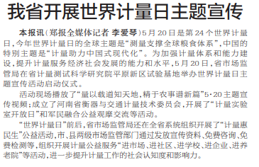 5月20日是第24个世界计量日,今年世界计量日的全球主题是“测量支撑全球粮食体系”,中国的特别主题是“计量助力中国式现代化”。为加强计量体系和能力建设,提升计量服务经济社会发展的能力和水平,5月20日,省市场监管局在省计量测试科学研究院平原新区试验基地举办世界计量日主题宣传活动启动仪式。(今日《郑州日报》2版)