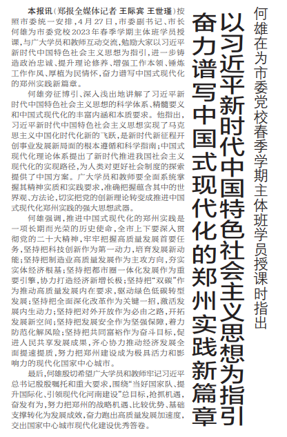 按照市委统一安排,4月27日,市委副书记、市长何雄为市委党校2023年春季学期主体班学员授课,与广大学员和教师互动交流,勉励大家以习近平新时代中国特色社会主义思想为指引,进一步铸造政治忠诚、提升理论修养、增强工作本领、锤炼工作作风、厚植为民情怀,奋力谱写中国式现代化的郑州实践新篇章。(今日《郑州日报》1版)
