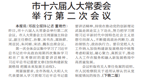 昨日,市十六届人大常委会举行第二次会议。市人大常委会主任周富强主持会议,副主任蔡红、孙黎、宋书杰、蒿铁群、周亚民、朱河顺、宋洁、魏东出席会议。(今日《郑州日报》1版、2版)