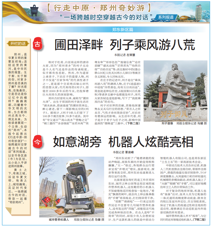 郑州,是华夏文明的重要发祥地;流经这里的黄河,是中华民族的摇篮。生于斯、长于斯的你,对家乡郑州是否真的了解?时光荏苒,沧海桑田,它是否还是你记忆中的模样?巍巍商都,闪耀着中华文明的光彩,为古都郑州点亮当今、照见未来。为给读者展现一个立体、生动的“郑州”,本报今起推出《行走中原·郑州奇妙游》“一场跨越时空穿越古今的对话”系列报道,以全市各区县(市)为区划,从小处入手讲述郑州故事。