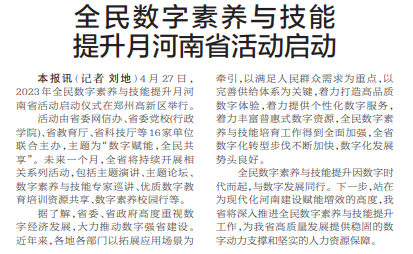4月27日,2023年全民数字素养与技能提升月河南省活动启动仪式在郑州高新区举行。(今日《郑州日报》1版)