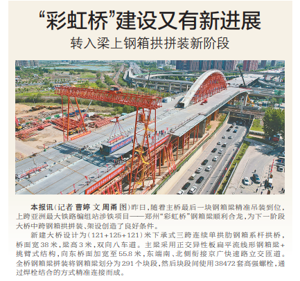 昨日,随着主桥最后一块钢箱梁精准吊装到位,上跨亚洲最大铁路编组站涉铁项目——郑州“彩虹桥”钢箱梁顺利合龙,为下一阶段大桥中跨钢箱拱拼装、架设创造了良好条件。(今日《郑州日报》1版)