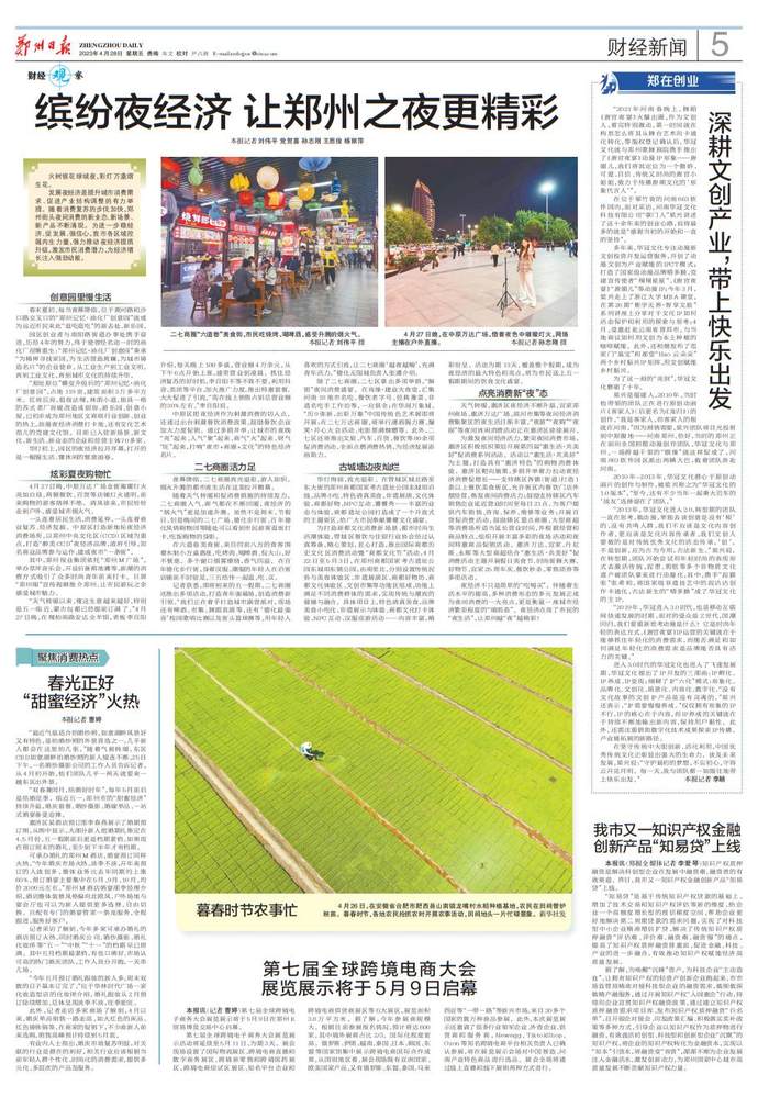 发展夜经济是提升城市消费需求、促进产业结构调整的有力举措。随着消费复苏的步伐加快,郑州街头夜间消费的新业态、新场景、新产品不断涌现。为进一步稳经济、促发展、强信心,我市各区域挖掘内生力量,强力推动夜经济提质升级,激发市民消费潜力,为经济增长注入强劲动能。(今日《郑州日报》5版)