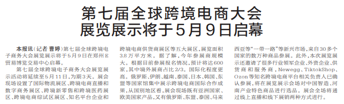 第七届全球跨境电子商务大会展览展示将于5月9日在郑州E贸易博览交易中心启幕。(今日《郑州日报》5版)