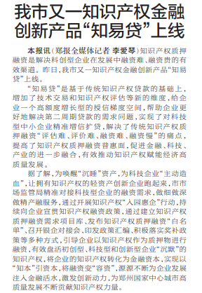 知识产权质押融资是解决科创型企业在发展中融资难、融资贵的有效渠道。昨日,我市又一知识产权金融创新产品“知易贷”上线。(今日《郑州日报》5版)