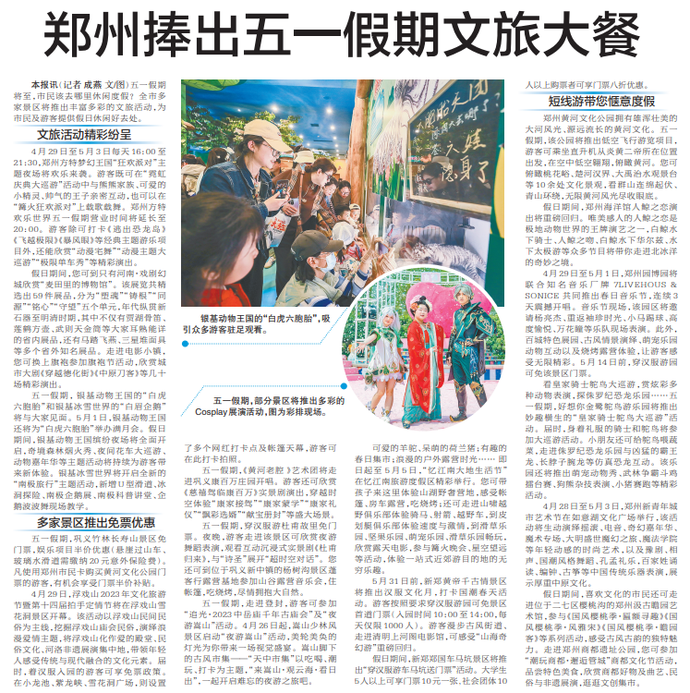 五一假期将至,市民该去哪里休闲度假?全市多家景区将推出丰富多彩的文旅活动,为市民及游客提供假日休闲好去处。(今日《郑州日报》6版)