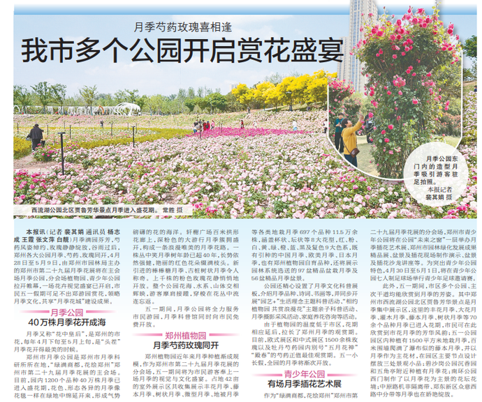 月季满园芬芳,芍药风姿绰约、玫瑰静静绽放,谷雨过后,郑州各大公园月季、芍药、玫瑰同开,4月28日至5月9日,由郑州市园林局主办的郑州市第二十九届月季花展将在主会场月季公园,分会场植物园、青少年公园拉开帷幕,一场花卉视觉盛宴已开启,市民五一假期可足不出郑游园赏花,领略月季文化,共享“月季花城”建设成果。(今日《郑州日报》6版)