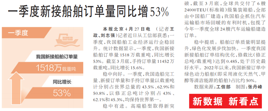一季度新接船舶订单量同比增53%