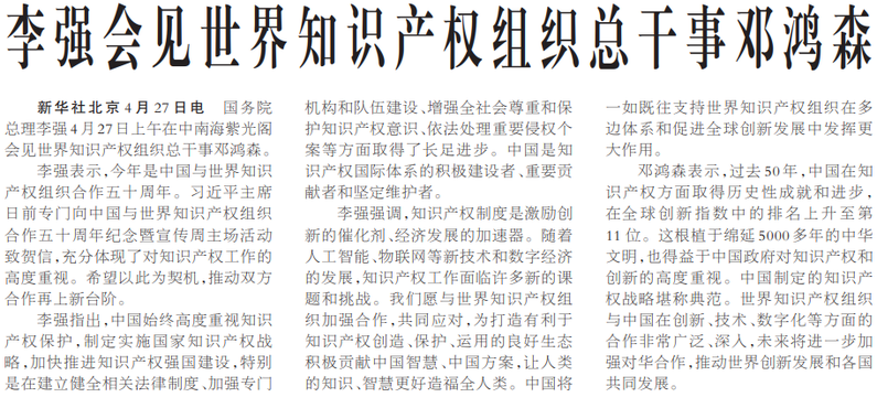 国务院总理李强4月27日上午在中南海紫光阁会见世界知识产权组织总干事邓鸿森。(今日《人民日报》1版)