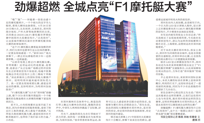 “嗖”“轰”……伴随着一张张动感十足的摩托艇照片,一个个硕大的汉字夺人眼球,看得人瞬间血脉偾张。4月26日至28日晚8点,从东到西、从南到北,郑州的部分地标、户外大屏等地屏幕同时点亮,共同推出2023U.I.M.F1摩托艇世界锦标赛中国郑州大奖赛宣传片,“点亮郑州”,让这座城市瞬间沉浸在世界摩托艇顶级大赛的浓厚氛围中。(今日《郑州日报》8版)