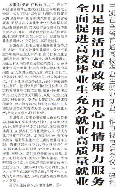 4月27日,我省召开普通高校毕业生就业创业工作电视电话会议。省长王凯出席会议并讲话,强调要深入贯彻党中央、国务院决策部署,落实省委要求,把促进高校毕业生就业作为稳增长稳就业的重要内容、实现经济运行整体好转的重要标志、推动主题教育走深走实的重要实践,抓实抓牢抓到位,千方百计促进高校毕业生顺利就业、充分就业、高质量就业。(今日《河南日报》1版)