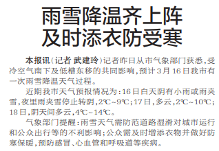 记者昨日从市气象部门获悉,受冷空气南下及低槽东移的共同影响,预计3月16日我市有一次雨雪降温天气过程。(今日《郑州日报》1版)