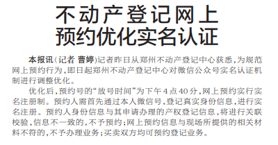 记者昨日从郑州不动产登记中心获悉,为规范网上预约行为,即日起郑州不动产登记中心对微信公众号实名认证机制进行调整优化。(今日《郑州日报》5版)