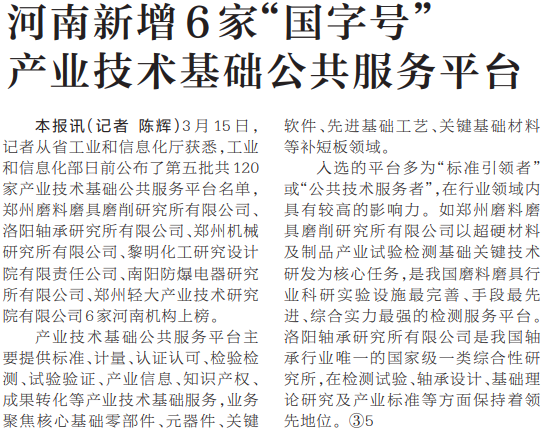 3月15日,记者从省工业和信息化厅获悉,工业和信息化部日前公布了第五批共120家产业技术基础公共服务平台名单,郑州磨料磨具磨削研究所有限公司、洛阳轴承研究所有限公司、郑州机械研究所有限公司、黎明化工研究设计院有限责任公司、南阳防爆电器研究所有限公司、郑州轻大产业技术研究院有限公司6家河南机构上榜。(今日《河南日报》4版)