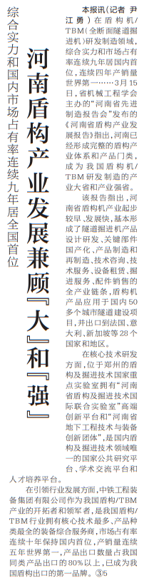 在盾构机/TBM(全断面隧道掘进机)研发制造领域,综合实力和市场占有率连续九年居国内首位,连续四年产销量世界第一……3月15日,省机械工程学会主办的“河南省先进制造报告会”发布的《河南省盾构产业发展报告》指出,河南已经形成完整的盾构产业体系和产品门类,成为我国盾构机/TBM研发制造的产业大省和产业强省。(今日《河南日报》3版)