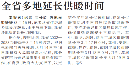 3月15日,记者从省住房城乡建设厅获悉,由于气温下降,我省多地决定延长供暖时间。(今日《河南日报》4版)