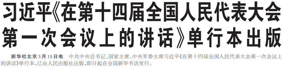 中共中央总书记、国家主席、中央军委主席习近平《在第十四届全国人民代表大会第一次会议上的讲话》单行本,已由人民出版社出版,即日起在全国新华书店发行。(今日《人民日报》1版)