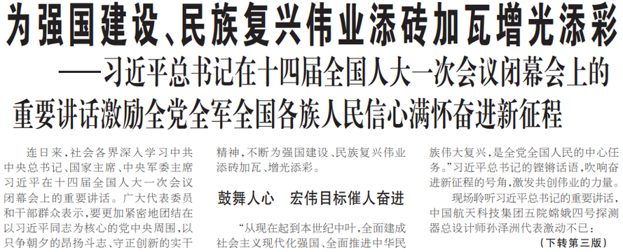 ——习近平总书记在十四届全国人大一次会议闭幕会上的重要讲话激励全党全军全国各族人民信心满怀奋进新征程