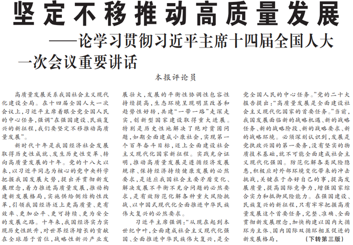 高质量发展关系我国社会主义现代化建设全局。在十四届全国人大一次会议上,习近平主席着眼全党全国人民的中心任务,强调“在强国建设、民族复兴的新征程,我们要坚定不移推动高质量发展”。(今日《人民日报》1版、3版)