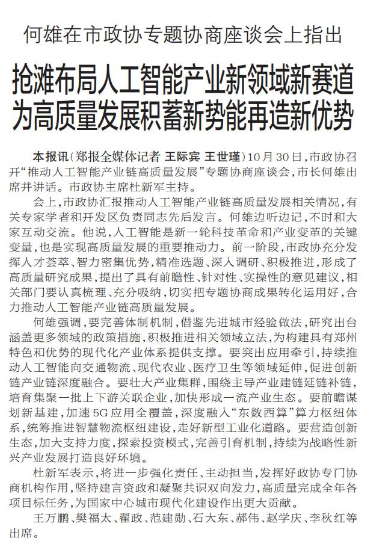 10月30日,市政协召开“推动人工智能产业链高质量发展”专题协商座谈会,市长何雄出席并讲话。市政协主席杜新军主持。(今日《郑州日报》1版)
