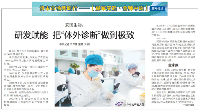 从代理产品起步,后来有了自己的GMP生产车间,进入试剂规模化生产阶段。(今日《郑州日报》1版、2版)