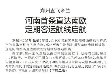 昨日,近300名旅客从郑州机场搭乘吉祥航空的宽体客机直飞意大利,郑州至米兰洲际定期客运航线顺利首航,这是河南首条直达南欧的定期洲际客运航线。(今日《郑州日报》1版、2版)