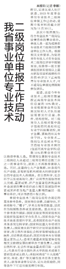 昨日,记者从省人社厅获悉,2023年度事业单位专业技术二级岗位申报工作已启动,受理申报材料的截止时间为11月30日。(今日《郑州日报》5版)