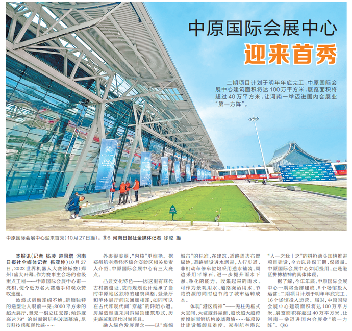 10月27日,2023世界机器人大赛锦标赛(郑州)盛大开幕,作为赛事主会场的省级重点工程——中原国际会展中心甫一亮相,便令近万名大赛选手和观众赞叹连连。(今日《河南日报》2版)