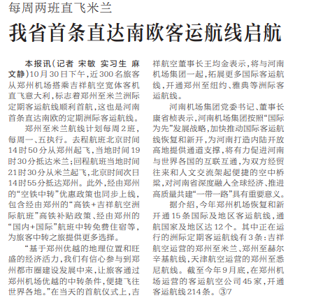 10月30日下午,近300名旅客从郑州机场搭乘吉祥航空宽体客机直飞意大利,标志着郑州至米兰洲际定期客运航线顺利首航,这也是河南首条直达南欧的定期洲际客运航线。(今日《河南日报》2版)
