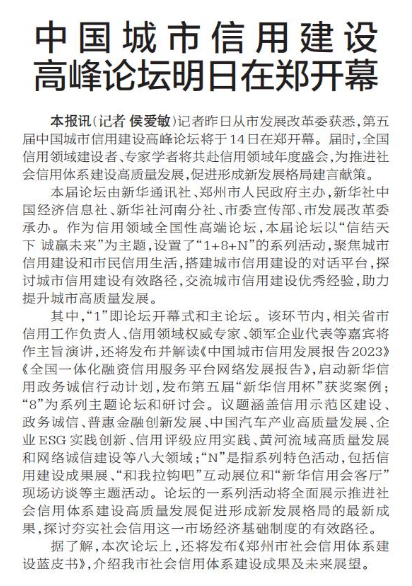 记者昨日从市发展改革委获悉,第五届中国城市信用建设高峰论坛将于14日在郑开幕。届时,全国信用领域建设者、专家学者将共赴信用领域年度盛会,为推进社会信用体系建设高质量发展,促进形成新发展格局建言献策。(今日《郑州日报》1版)