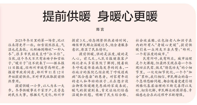 2023年冬日里的第一场雪,比以往来得更早一些。初雪固然很美,气温也是真低。从短袖到棉袄“一秒入冬”,很多市民朋友直呼“扛不住”。当然,这个冬天不只有冰碴子和雪粒子,“暖日子”这不就来了——据本报11日报道,经郑州市城管局研究,并报请市政府同意,郑州市11月12日开始提前供热,不对市民收取提前供热费用。(今日《郑州日报》1版)