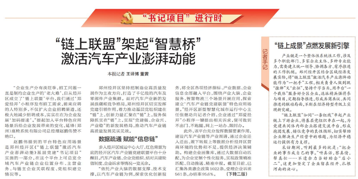 “企业生产分有淡旺季,招工问题一直是制约企业生产的‘老大难’,自从经开区成立了‘链上联盟’平台,我们通过‘郑爱经开’小程序发布招工需求,前来应聘的人特别多,不仅扩大企业招聘渠道,还极大地减少招聘成本,实实在在为企业发展‘加码提速’。”提起加入平台特色应用场景后给企业发展带来的变化,延锋(郑州)座椅系统有限公司总经理赵鹏伟赞不绝口。(今日《郑州日报》1版、2版)