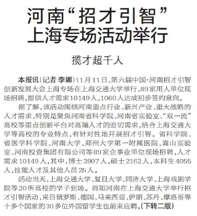 11月11日,第六届中国·河南招才引智创新发展大会上海专场在上海交通大学举行,89家用人单位现场招聘,提供人才需求10149人,1060人达成初步签约意向。(今日《郑州日报》1版、2版)