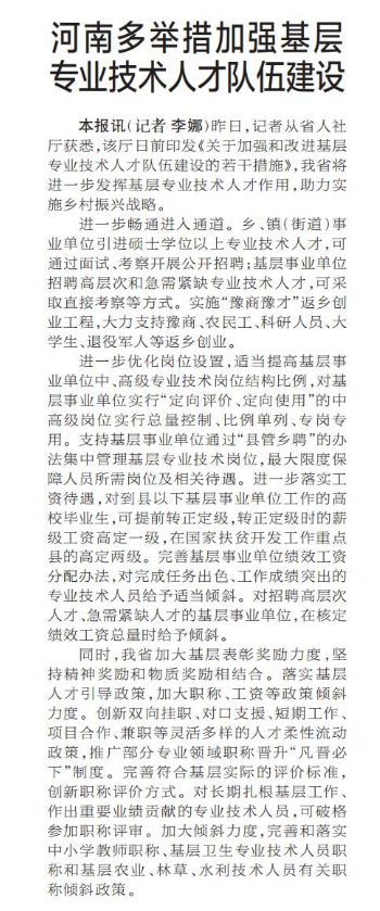 昨日,记者从省人社厅获悉,该厅日前印发《关于加强和改进基层专业技术人才队伍建设的若干措施》,我省将进一步发挥基层专业技术人才作用,助力实施乡村振兴战略。(今日《郑州日报》2版)