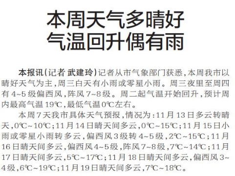记者从市气象部门获悉,本周我市以晴好天气为主,周三白天有小雨或零星小雨。周三夜里至周四有4~5级偏西风,阵风7~8级。周二起气温开始回升,预计周内最高气温19℃,最低气温0℃左右。(今日《郑州日报》5版)