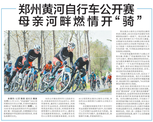 11月12日,“巴迪瑞杯”2023郑州黄河自行车公开赛,在郑州市惠济区南裹头广场黄河滩区举行。近1500名专业运动员和自行车运动爱好者汇聚一堂竞速比拼,在燃情骑行中近距离感受中华民族母亲河的风采,传承弘扬黄河文化。(今日《郑州日报》6版)