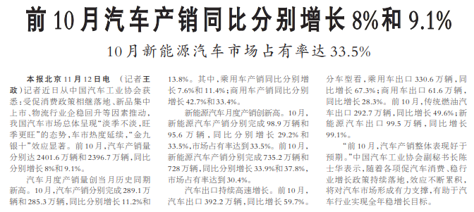 前10月汽车产销同比分别增长8%和9.1%