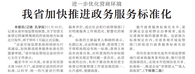 11月10日,记者从省市场监管局获悉,关于经营主体登记档案管理规范的省级地方标准近日发布,将于明年1月起正式实施。(今日《河南日报》1版、2版)