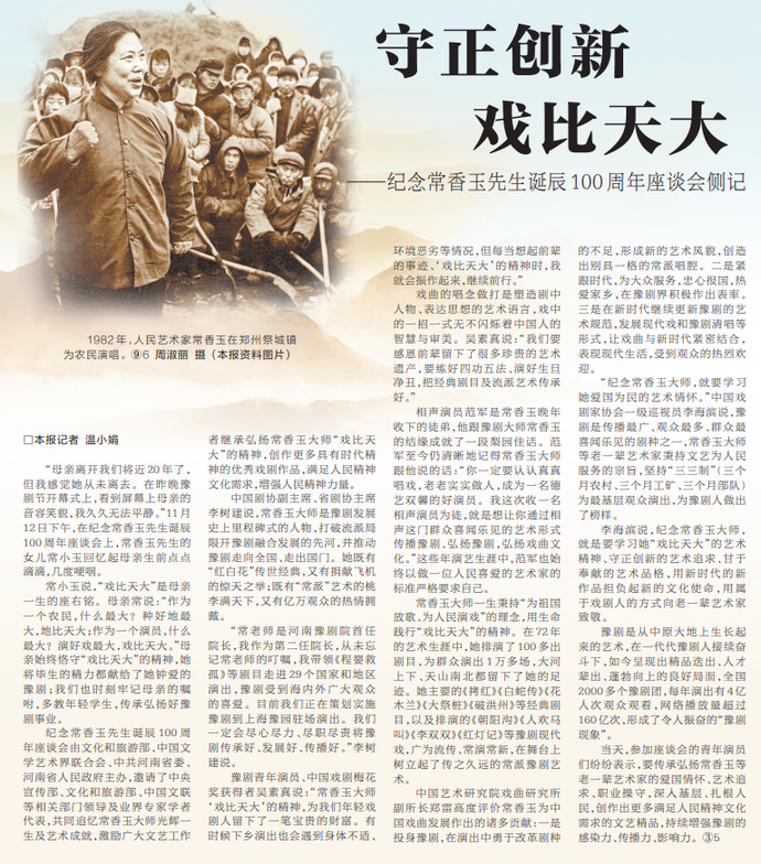 “母亲离开我们将近20年了,但我感觉她从未离去。在昨晚豫剧节开幕式上,看到屏幕上母亲的音容笑貌,我久久无法平静。”11月12日下午,在纪念常香玉先生诞辰100周年座谈会上,常香玉先生的女儿常小玉回忆起母亲生前点点滴滴,几度哽咽。(今日《河南日报》2版)