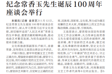 11月12日,纪念常香玉先生诞辰100周年座谈会在郑州举行,深入学习贯彻习近平文化思想,深切缅怀追思“人民艺术家”常香玉的生平事迹、重要贡献和精神品格,推动戏曲艺术繁荣发展,为担负起新的文化使命贡献力量。(今日《河南日报》2版)