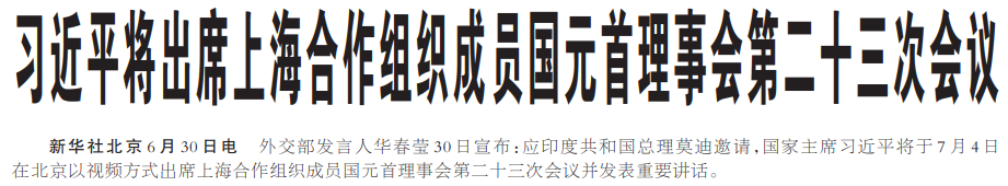 外交部发言人华春莹30日宣布:应印度共和国总理莫迪邀请,国家主席习近平将于7月4日在北京以视频方式出席上海合作组织成员国元首理事会第二十三次会议并发表重要讲话。(今日《人民日报》1版)