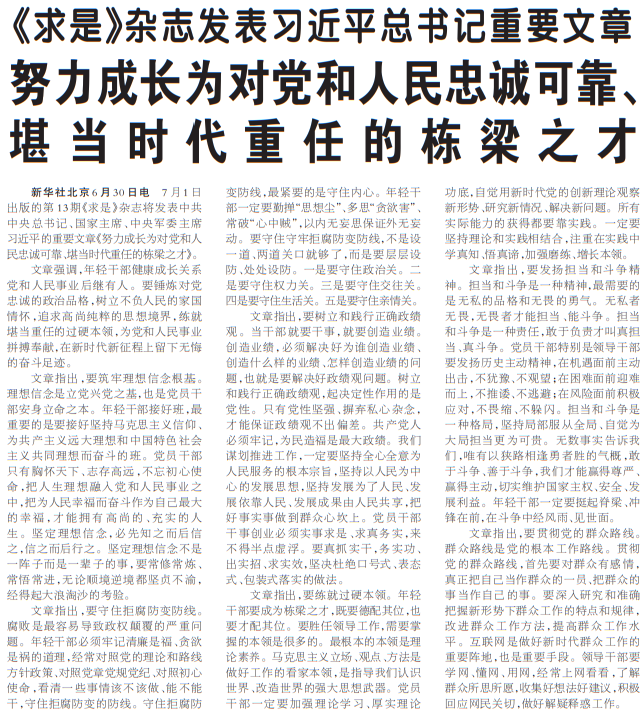 7月1日出版的第13期《求是》杂志将发表中共中央总书记、国家主席、中央军委主席习近平的重要文章《努力成长为对党和人民忠诚可靠、堪当时代重任的栋梁之才》。