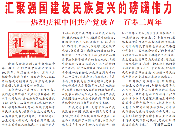 潮涌东方起宏图,百年大党正青春。今天,我们迎来中国共产党成立102周年。踔厉奋发守初心,笃行不怠担使命,新时代的中国共产党人,正以昂扬奋进的精神状态,阔步行进在强国建设、民族复兴的新征程上。(今日《人民日报》1版、2版)