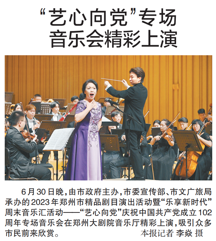 6月30日晚,由市政府主办,市委宣传部、市文广旅局承办的2023年郑州市精品剧目演出活动暨“乐享新时代”周末音乐汇活动——“艺心向党”庆祝中国共产党成立102周年专场音乐会在郑州大剧院音乐厅精彩上演,吸引众多市民前来欣赏。(今日《郑州日报》1版)